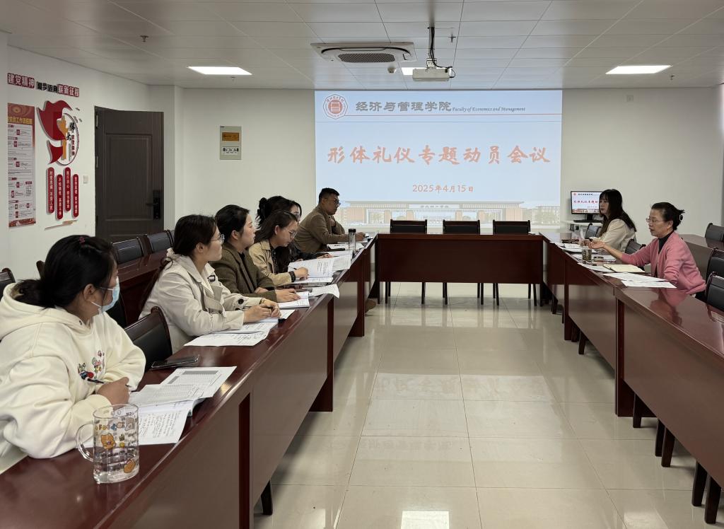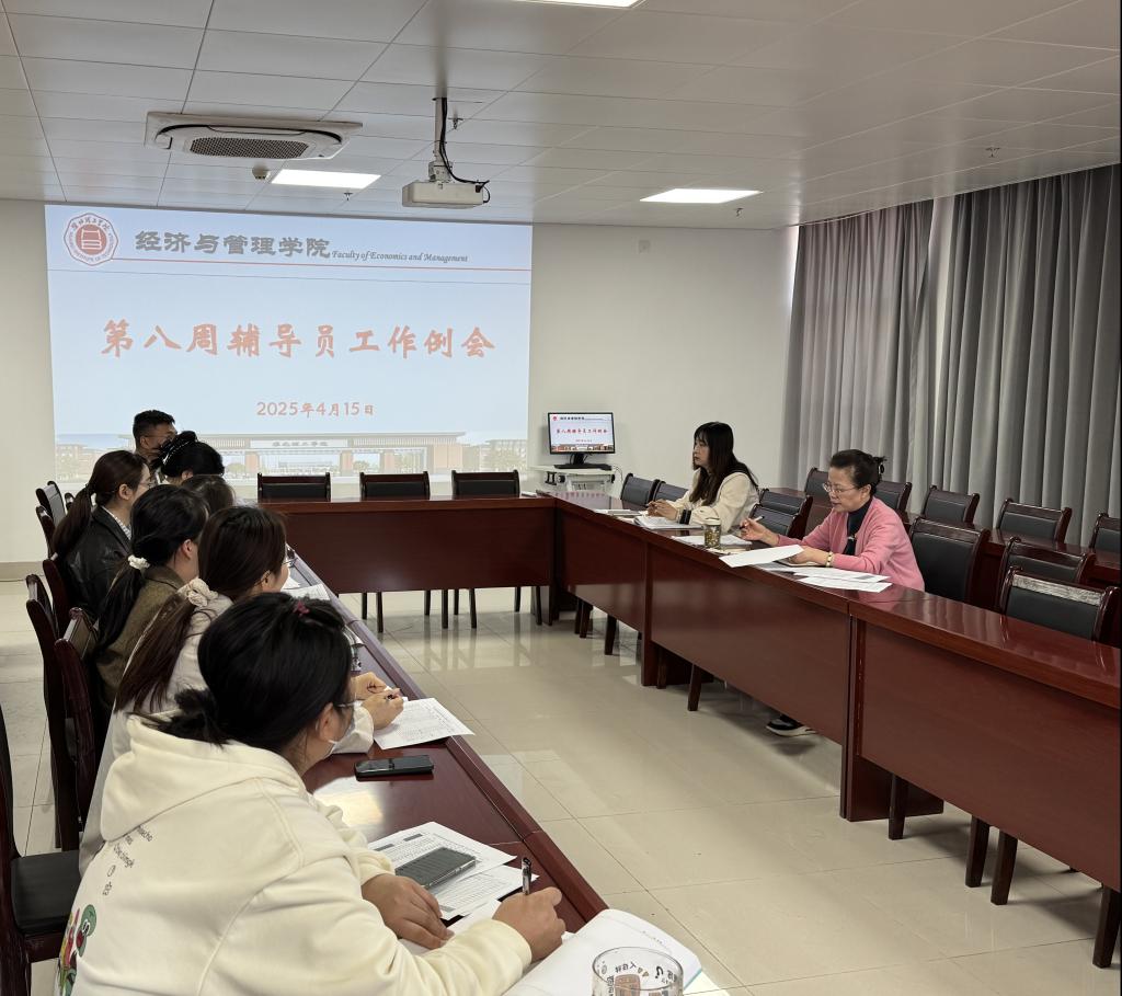 2025年4月15日,永利集团304am登录在行政楼725会议室召开本学期第八周学生管理工作例会暨形体礼仪专题动员会议,学院书记助理员禹辛及全体辅导员参会,会议由院长吴玲主持。