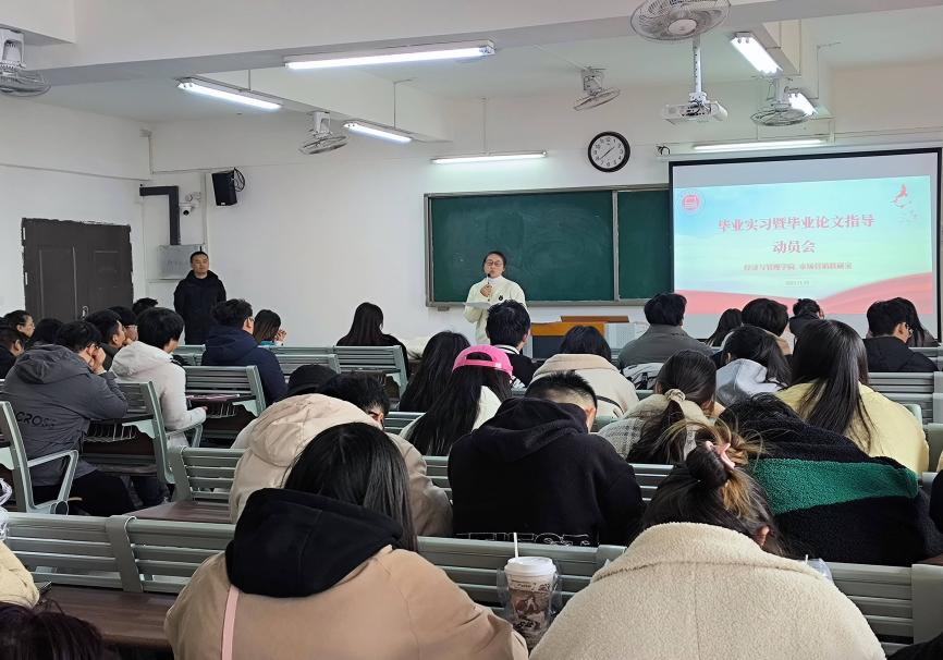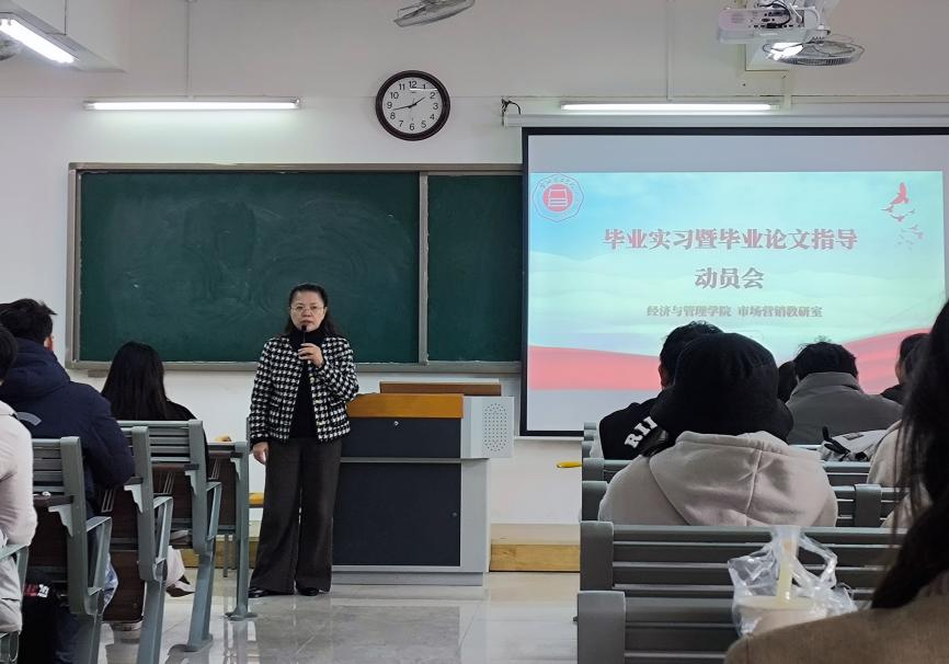为进一步提升学生的就业竞争力,增加社会实践知识,保证2024届学生实习工作顺利开展,帮助学生了解实习安排,202311月15日下午经济与管理学院市场营销专业二教421室顺利召开了2024届毕业实习暨毕业论文指导动员会。经济与管理学院长吴玲市场营销教研室全体指导教师及2022级市场营销专升本学生参加会议会议由教研室负责人刘路路主持。