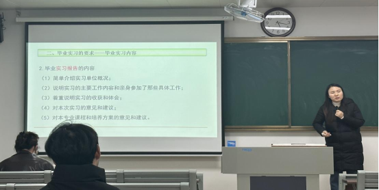 首先,兰露老师针对实习管理规定、安全教育、实习管理手册填写方法、要求,以及对实习考核的重要环节进行了详细说明,并且就毕业实习工作进行了四方面的强调,一是认识到毕业实习是本科人才培养过程中极为重要的教学环节;二是要求实习指导教师与学生加强沟通交流,认真开展实习指导工作;三是要求毕业生做好实习规划,端正实习态度,认真完成实习任务;四是确保人身安全、交通安全等相关工作。