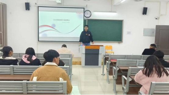 第二场招聘是北京方正科技信息产品有限公司,该公司本次招聘的岗位包括:信用卡分期顾问、电商售前、400售后。招聘会上,负责人事招聘的邱纪红通过播放宣传片、PPT展示、面对面交流等方式向同学们介绍公司的概况、职业发展方向、人员需求以及选择该单位的理由等。同学们在听完宣讲后,积极进行相关招聘岗位的咨询,并积极投递简历,现场有15名同学投递简历。