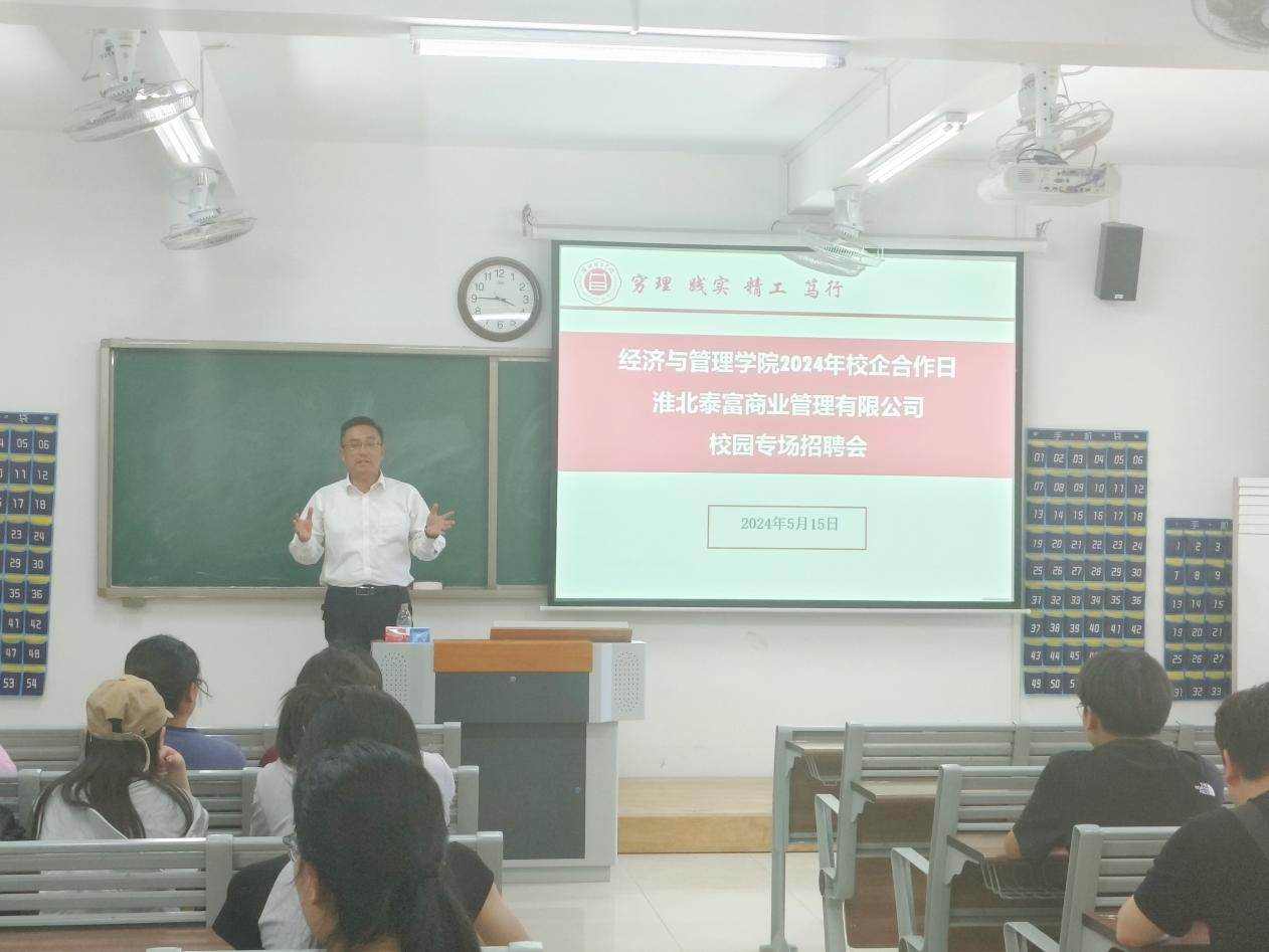 淮北泰富商业管理有限公司作为当地知名的商业服务企业,对经济管理人才有着迫切的需求。在宣讲会上,公司代表田经理详细介绍了公司的发展历程、企业文化以及未来的人才需求。公司表示,将为毕业生提供丰富的实践机会和广阔的发展平台,助力他们在实践中成长,共同创造美好未来。