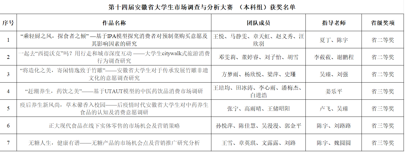 2024年4月,由安徽省教育厅主办的第十四届安徽省大学生市场调查与分析大赛(本科组、B类赛事)于安徽财经大学落下帷幕。通过知识赛、实践赛校赛、实践赛省赛等层层选拔,我校晋级省赛的7支队伍,分别获得省级二等奖3项、省级三等奖4项。